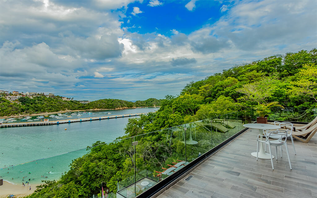 Terraza equipada con mobiliario y vista a la bahía de Santa Cruz.